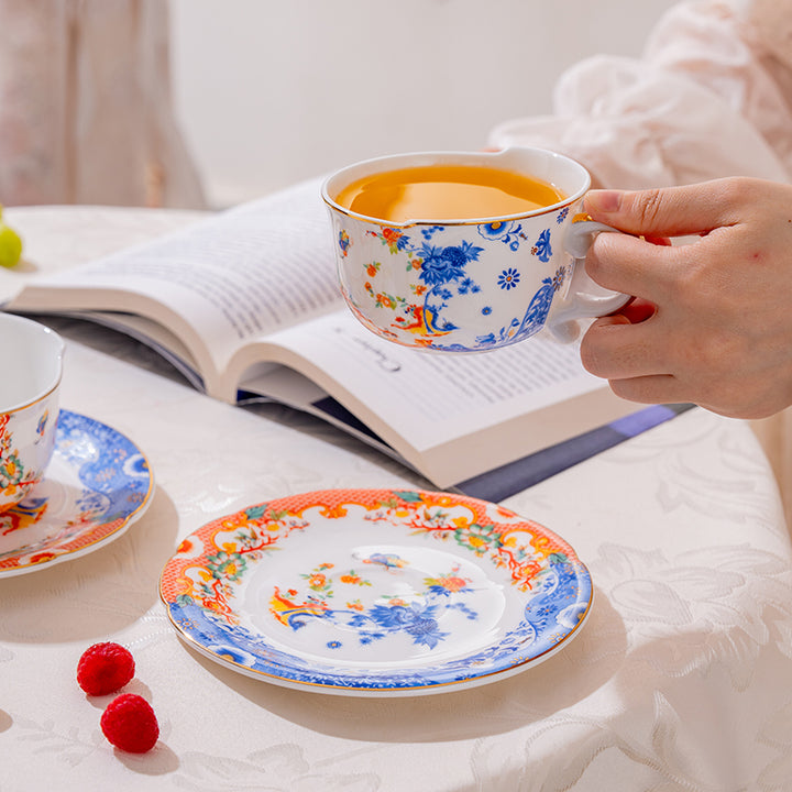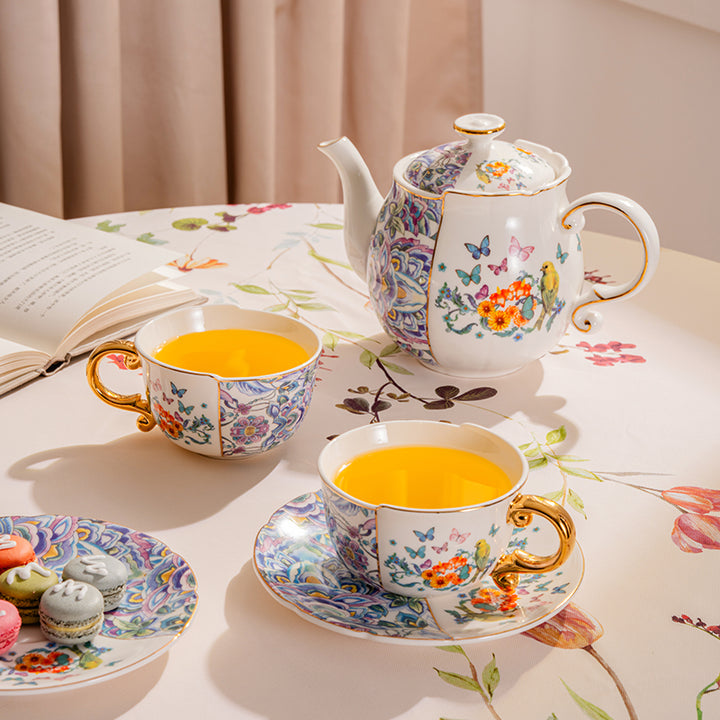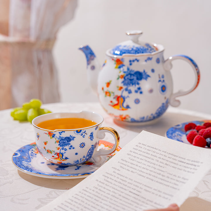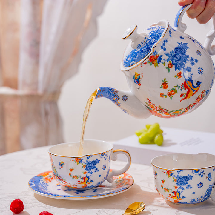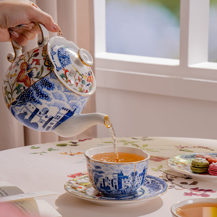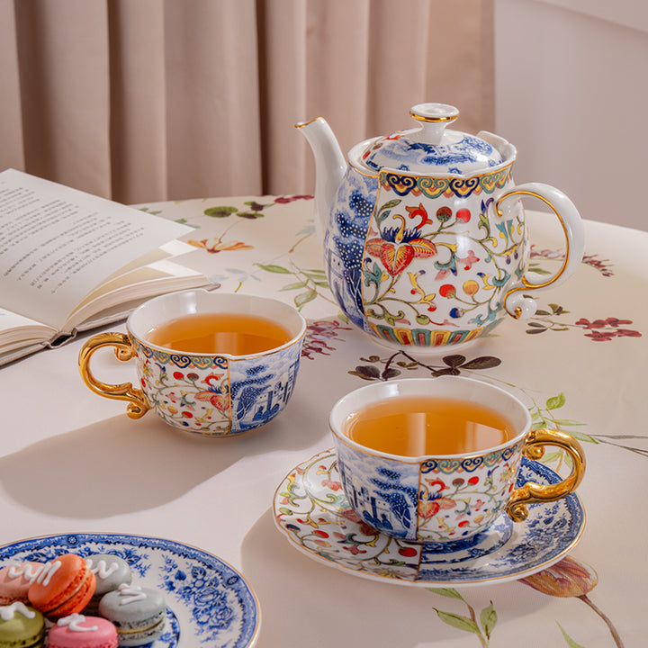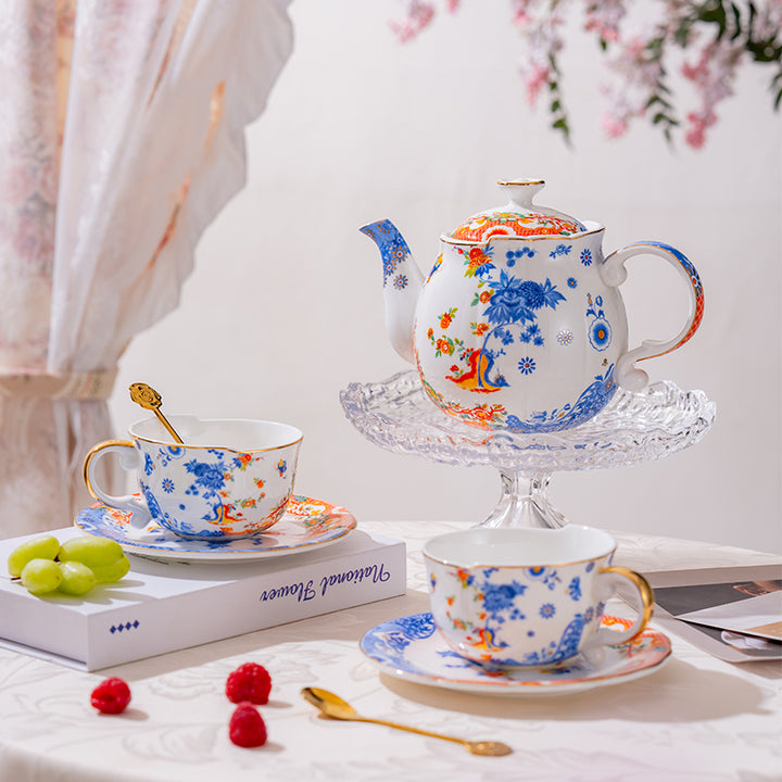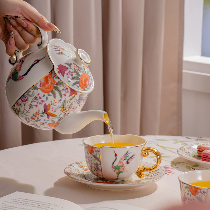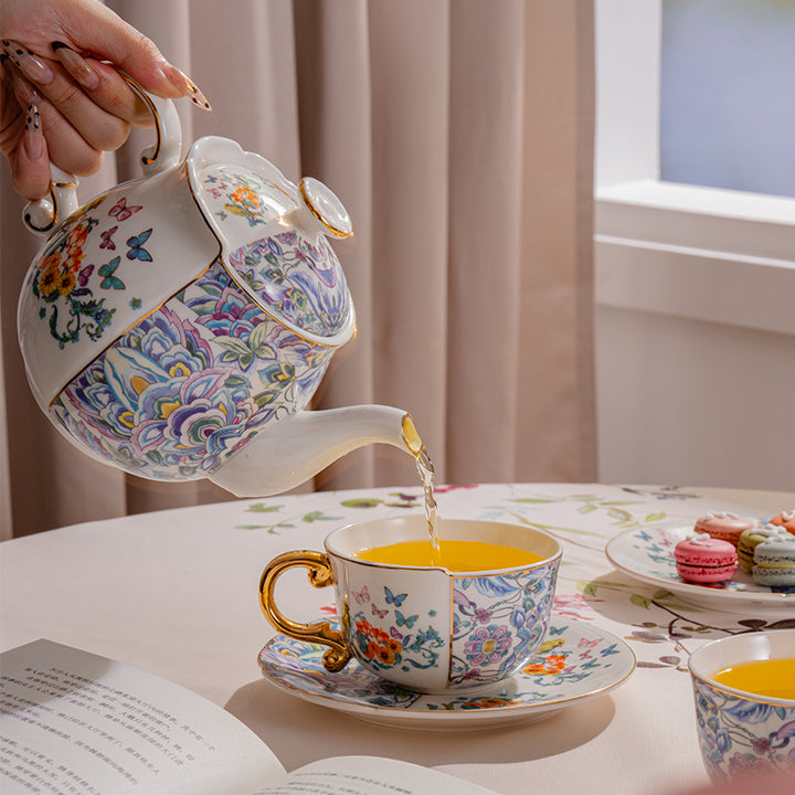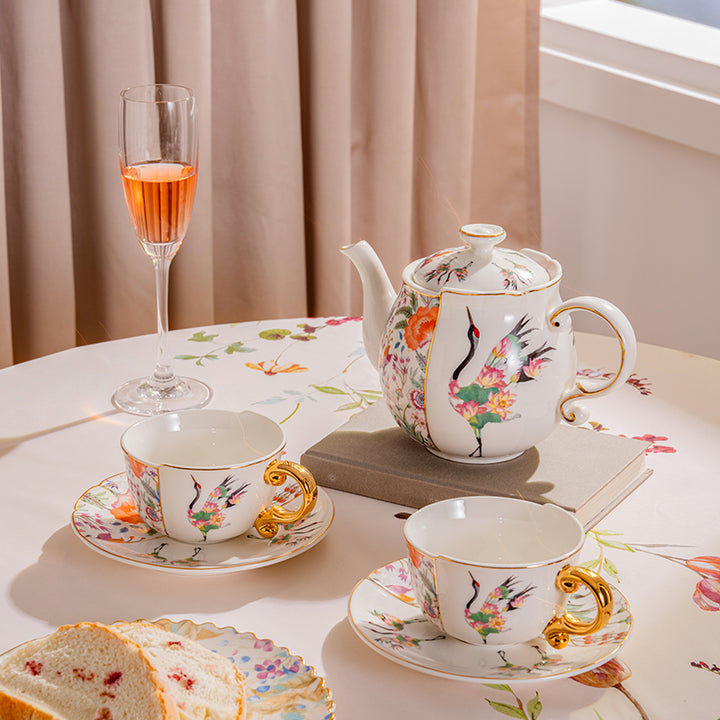 Detail Description Limited small-batch release; four dual-culture designs (Celestial Reverie, Phoenix Silk Slippers, Rosy Cloud, Mixed Vintage). 45 %+ bone-ash bone china for thin, translucent, resonant quality; hand-painted 24K gold on handle, knob & cup rims