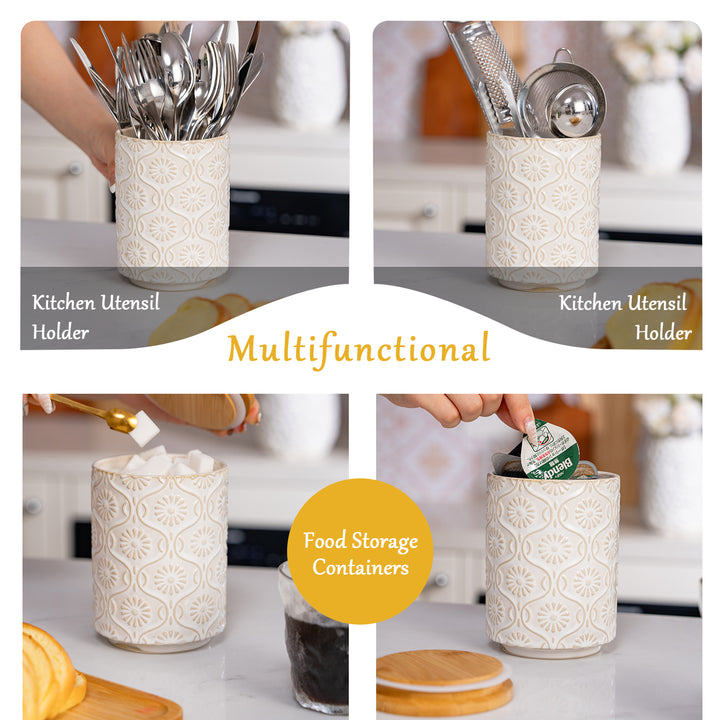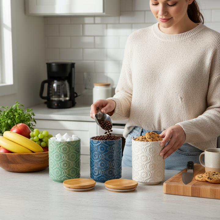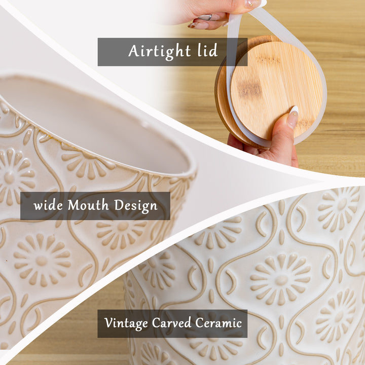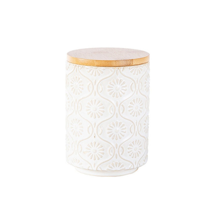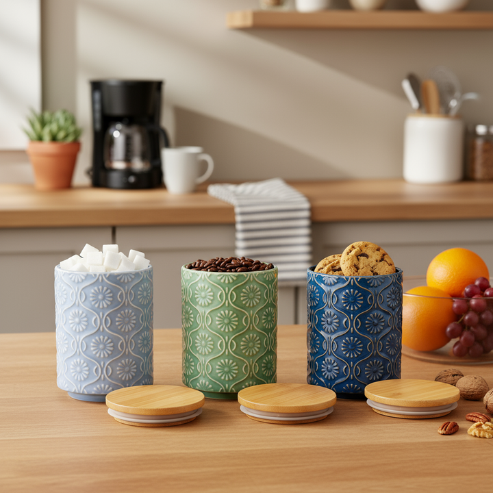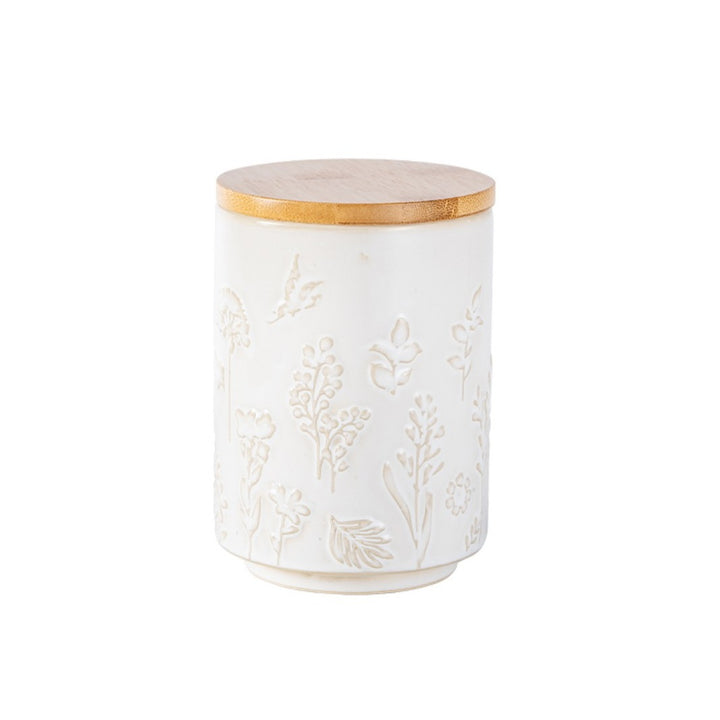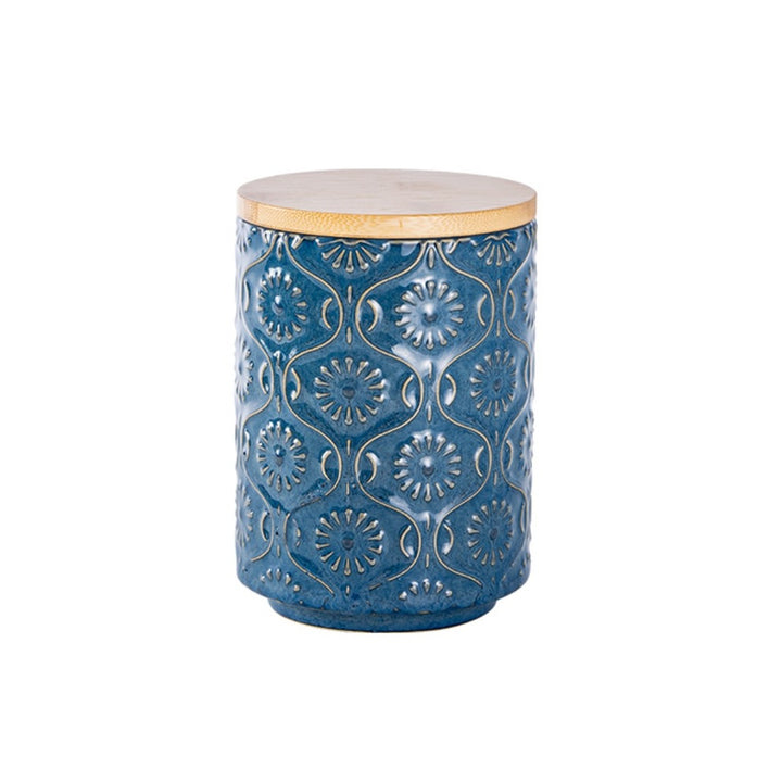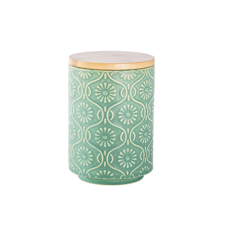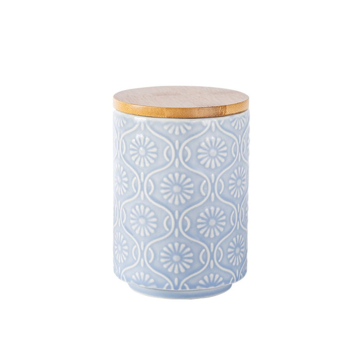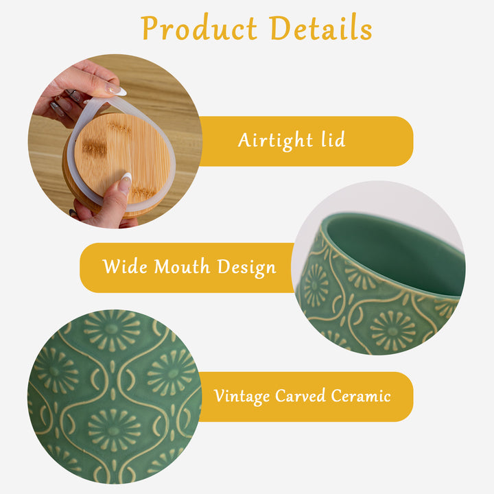 Detail Description Embossed kiln-finish ceramic in 5 colors (White, Green, Light Blue, Navy Blue, White Garden). Airtight bamboo lid with silicone ring locks out moisture & air. Compact 30 oz footprint fits any counter. Easy-seal tip: press air-vent side last for perfect closure. Tidy, fresh, stylish.