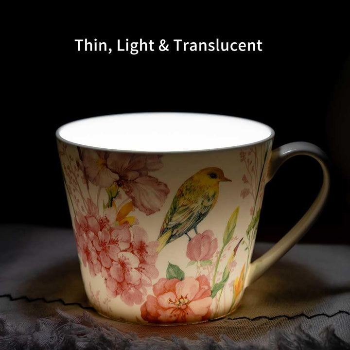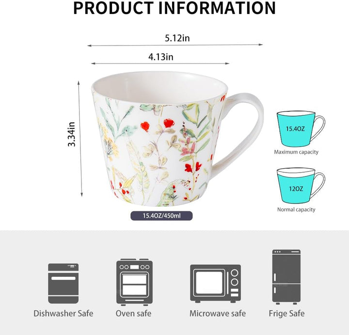 Detail Description Premium lightweight yet sturdy bone china; four distinct watercolor-style designs (florals, birds, foliage) bring an outdoorsy freshness; comfortable handles and 15.2 oz capacity suit generous pours; effortless cleanup—rinse or machine wash.