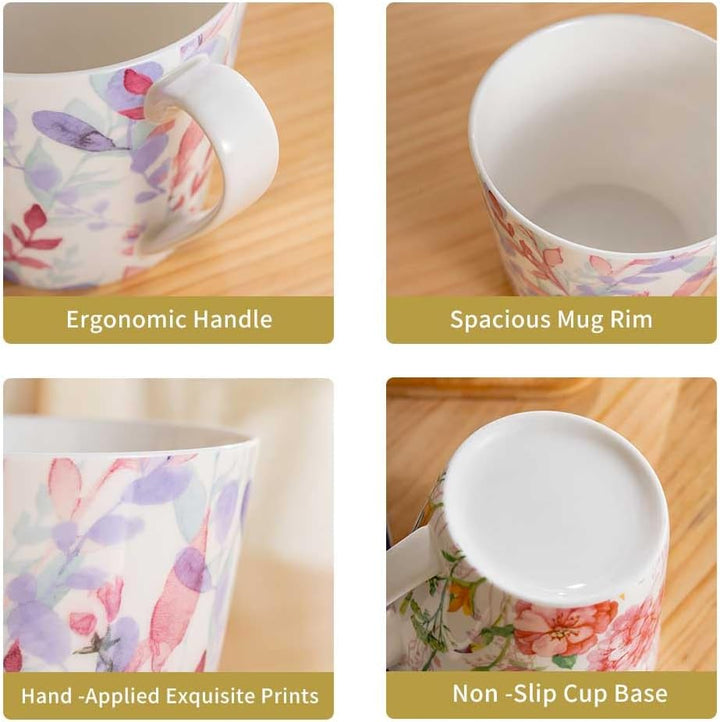 Coffee Mugs Set of 4 – 15.2 oz (450 ml) Large Bone China Mugs, Flowers & Birds Design