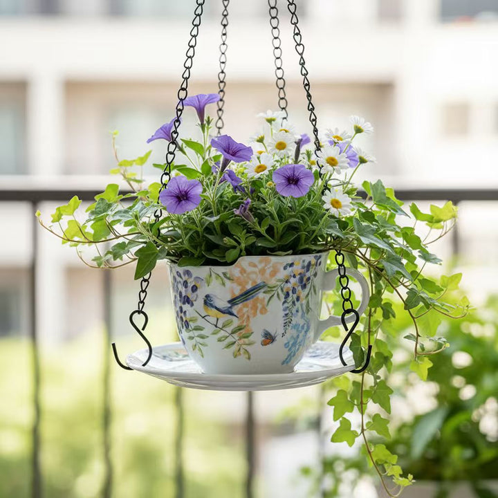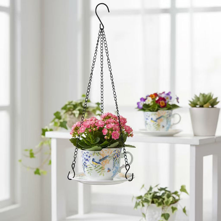 | Detail Description | Instagram-ready cup-and-saucer silhouette hand-decorated with vibrant florals & birds; high-fire ceramic withstands weather; 2-in-1 use as planter or candle holder; 30-second hook installation with included 19.7" chain; compact 6.3" footprint perfect for small-space décor. |