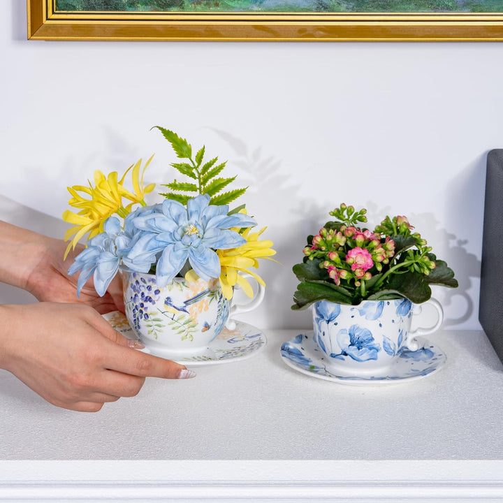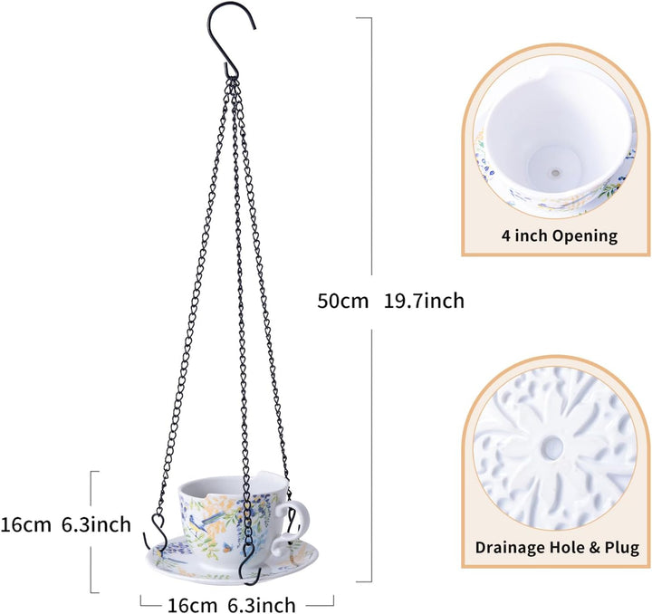 1. Instagram-ready cup-&-saucer design, hand-appliquéd florals + birds for instant color pop.2. High-fire ceramic + rust-proof iron chain = weather-tough, 360° balcony-to-living-room safe.3. 2-in-1 versatility: planter for herbs/succulents or candle bowl...
