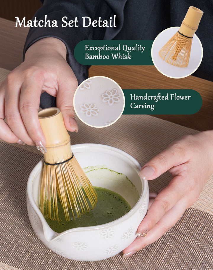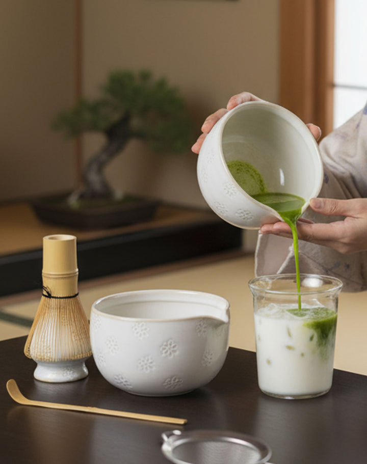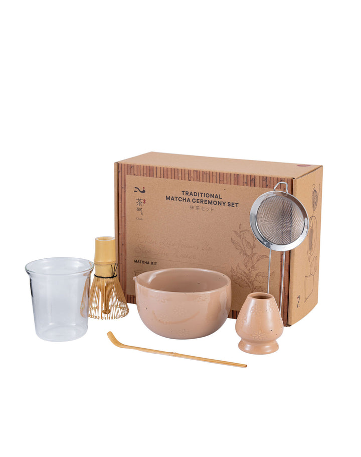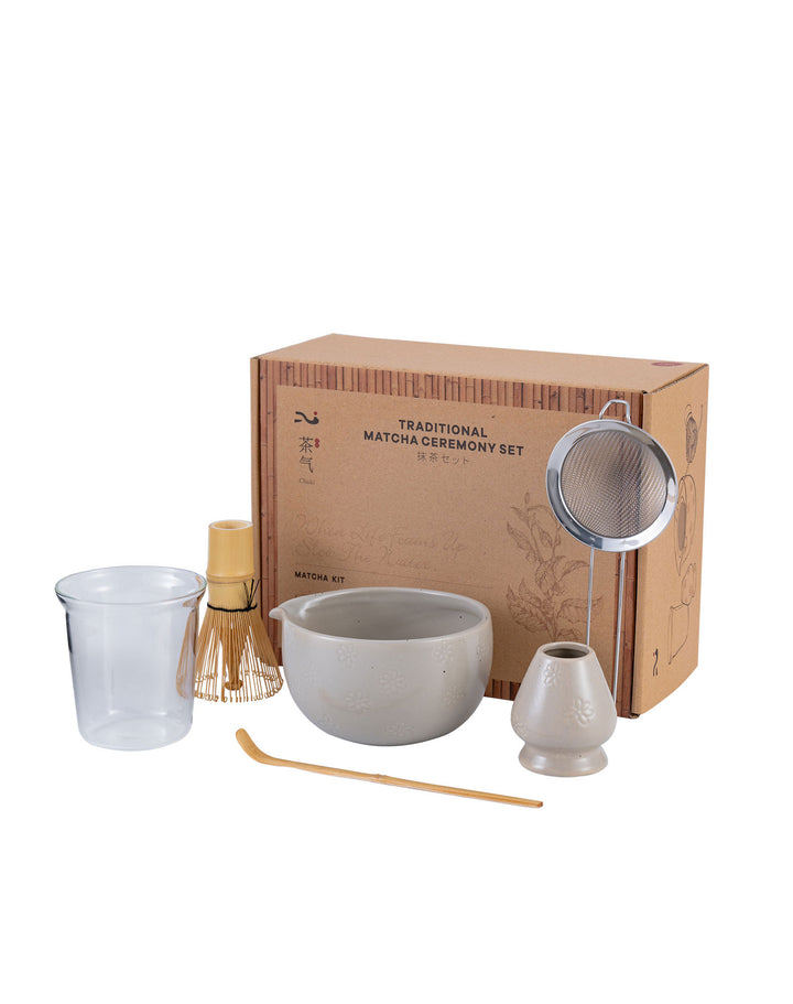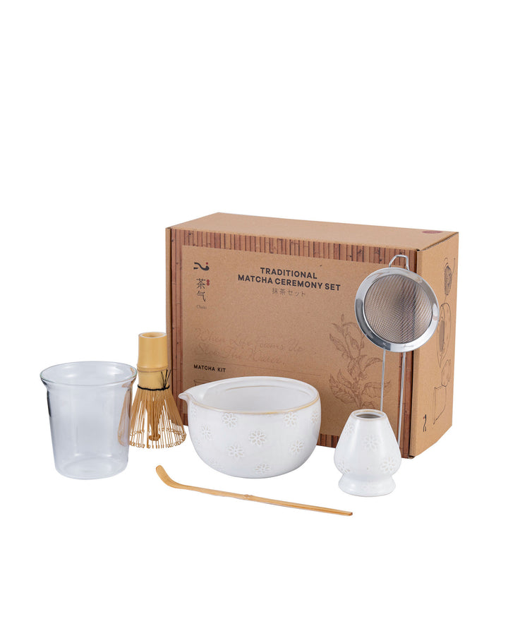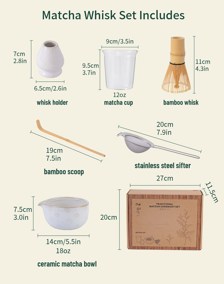 Set Contents 1 ceramic matcha bowl (Chawan), 1 bamboo whisk (Chasen), 1 ceramic whisk holder, 1 stainless-steel fine-mesh sifter, 1 bamboo scoop (Chashaku), 1 matcha cup; gift-ready box (matcha powder NOT included)